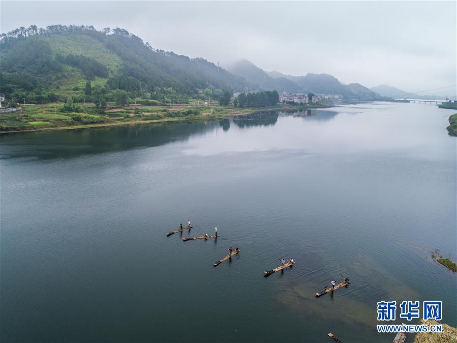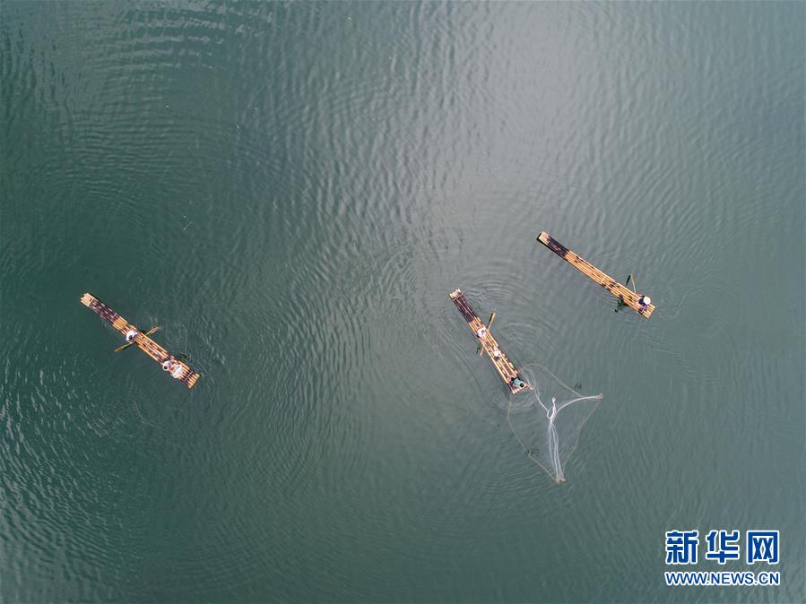 8月1日,淳安縣汾口鎮(zhèn)紅星村的漁民乘著竹排,在千島湖的支流武強(qiáng)溪上進(jìn)行撒網(wǎng)捕撈作業(yè)(無人機(jī)拍攝)。 新華社記者 徐昱攝