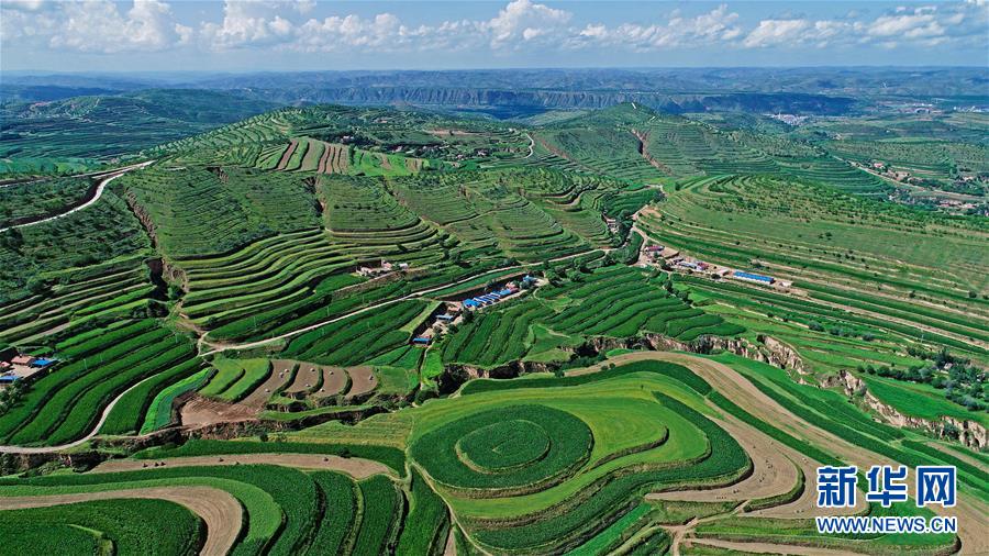 寧夏固原市彭陽(yáng)縣金雞坪梯田公園(7月16日無(wú)人機(jī)拍攝)。新華社記者 王鵬 攝