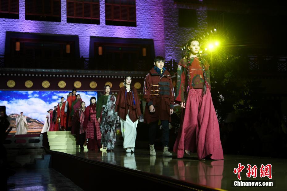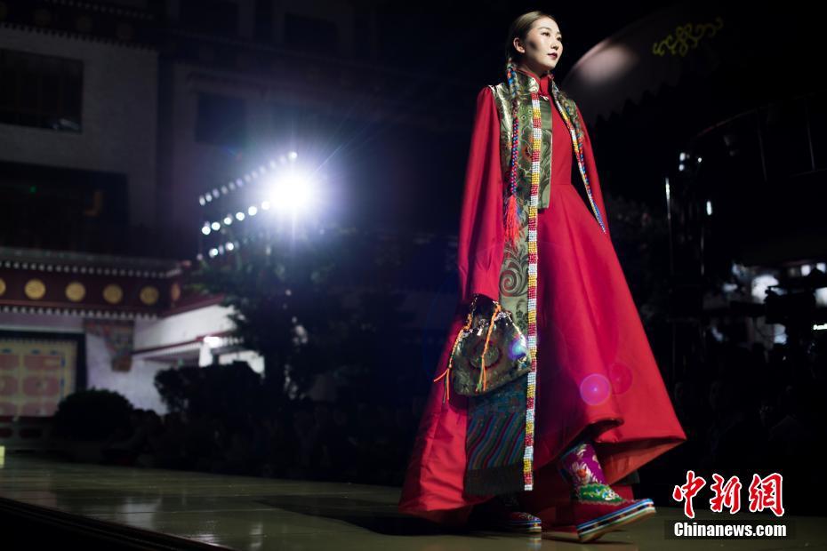 8月12日晚,由西藏職業(yè)技術(shù)學院與北京服裝學院共同打造的“凈美雪頓·美好生活”西藏民族服裝與服飾展演活動在拉薩舉行。現(xiàn)場通過傳統(tǒng)篇、現(xiàn)代篇與未來篇三個篇章,展演了藏族傳統(tǒng)服裝26套,設(shè)計創(chuàng)新服裝58套,共計84套服裝。圖為模特展示現(xiàn)代設(shè)計的創(chuàng)新藏族服飾。中新社記者何蓬磊 攝