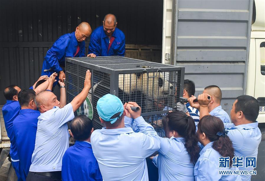 8月20日,工作人員推送大熊貓至運輸車處。 新華社記者 許暢 攝