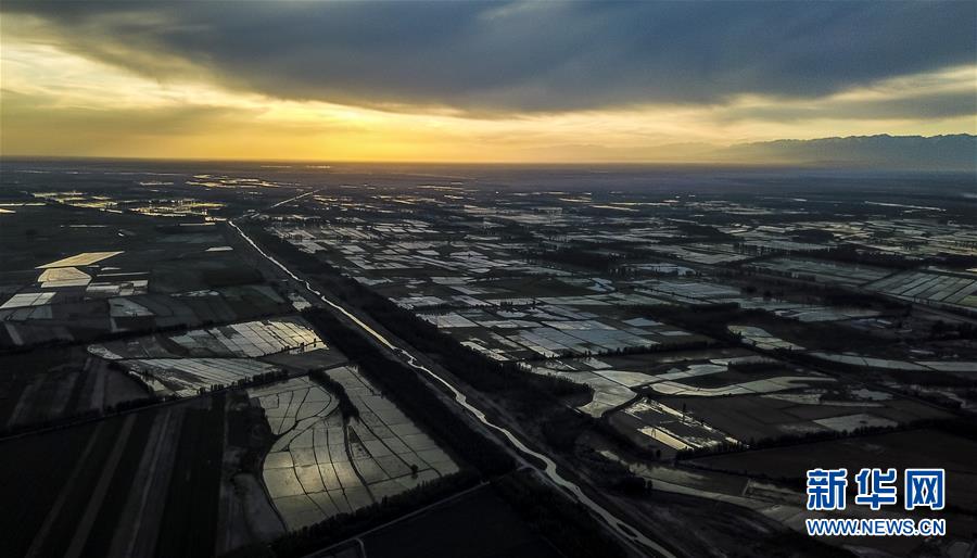 在新疆察布查爾錫伯自治縣種羊場托海依村拍攝的夕陽下的農(nóng)田(5月21日無人機拍攝)。近日,隨著氣溫漸高,地處新疆伊犁河谷的察布查爾錫伯自治縣迎來插秧高峰期,田間地頭一派繁忙景象。塊塊稻田水滿如鏡,田間防護林枝繁葉茂,遠處雪山依稀可見,如一幅在大地上鋪展開的生態(tài)畫卷。新華社記者胡虎虎 攝