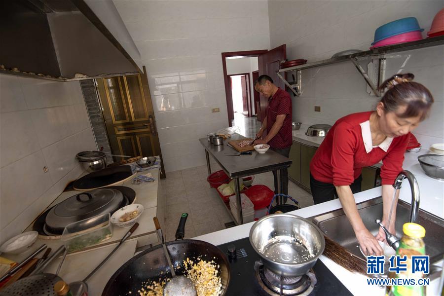 堰河村一對(duì)夫妻在自家新民居的廚房里忙活(5月12日攝)。