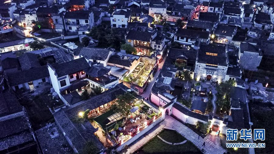 這是5月8日無(wú)人機(jī)拍攝的安徽黟縣宏村古民居夜景。