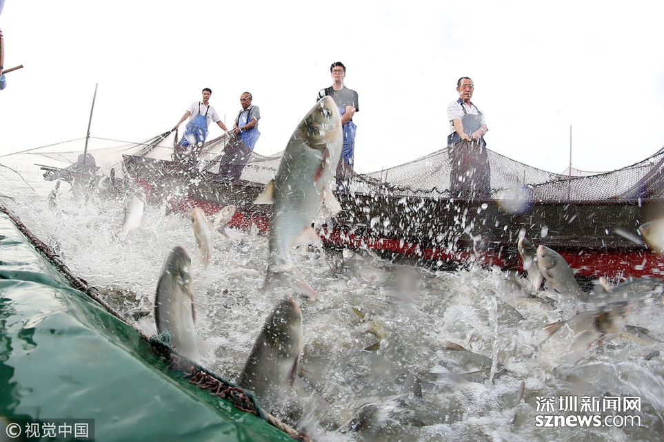 ???? 2018年6月26日,江蘇省常州市嘉澤鎮(zhèn)捕撈村的漁民組織夏季捕撈,一網(wǎng)魚達五萬余斤,以鰱魚為主,供應市場需求。夏捕的魚價較平時有所上漲,漁民粗略估計可增收上萬余元。