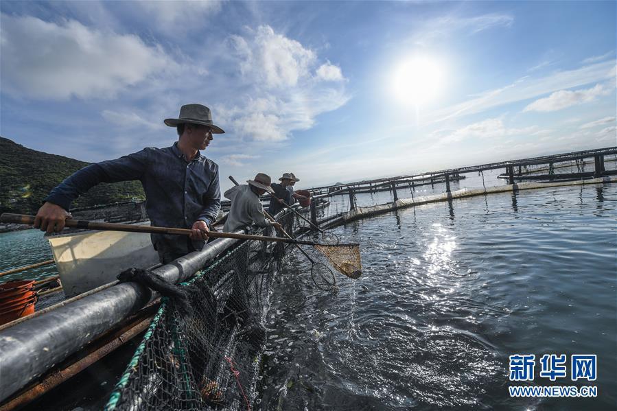 8月18日,南麂島海域的“海上牧場(chǎng)”養(yǎng)殖區(qū)內(nèi),漁民正捕撈大黃魚,處于仿生養(yǎng)殖環(huán)境的大黃魚需要生長(zhǎng)2至3年。進(jìn)入8月,浙江省溫州市平陽(yáng)縣南麂鎮(zhèn)海域上大片的大黃魚、貽貝等特色海產(chǎn)品養(yǎng)殖區(qū)域迎來(lái)豐收季節(jié),養(yǎng)殖戶們駕駛漁船在養(yǎng)殖區(qū)海域進(jìn)行打撈收獲,在碧海藍(lán)天下構(gòu)成了一幅“海上牧場(chǎng)”的美麗豐收景象。近年來(lái),南麂鎮(zhèn)政府引導(dǎo)漁民養(yǎng)殖戶充分發(fā)揮“靠海吃海”的資源優(yōu)勢(shì),大力發(fā)展海洋養(yǎng)殖經(jīng)濟(jì)和海島旅游經(jīng)濟(jì),實(shí)現(xiàn)了南麂由“生態(tài)美”向“產(chǎn)業(yè)美”,“產(chǎn)業(yè)美”向“經(jīng)濟(jì)美”的轉(zhuǎn)變。同時(shí)該鎮(zhèn)堅(jiān)持以大黃魚、貽貝等為特色產(chǎn)業(yè)支撐,精準(zhǔn)發(fā)展高效海洋養(yǎng)殖業(yè),重點(diǎn)培養(yǎng)一批新型職業(yè)漁民,依靠專業(yè)技術(shù)支持,實(shí)現(xiàn)深海仿生養(yǎng)殖,讓好生態(tài)造就好品質(zhì),重點(diǎn)打造南麂養(yǎng)殖品牌,組建營(yíng)銷網(wǎng)絡(luò),拓展特色海產(chǎn)品市場(chǎng)。新華社記者 徐昱攝