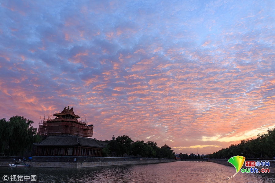 2018年9月5日,北京迎晴好天氣,傍晚時分,落日晚霞美不勝收。天空出現(xiàn)美麗的火燒云,映照故宮博物院角樓。圖片來源:視覺中國