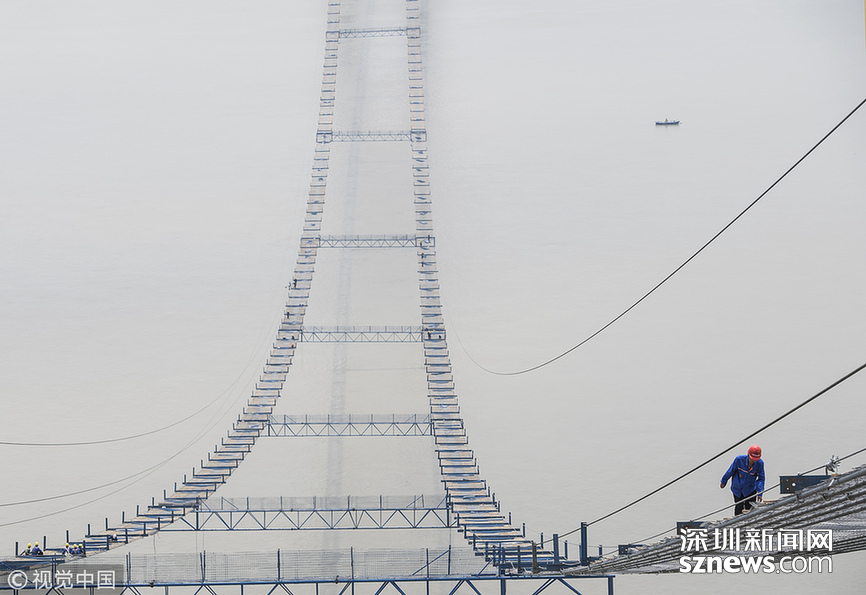 14日11時(shí)許,記者在228.8米高空建設(shè)現(xiàn)場感受到,高空風(fēng)力在6級(jí)上下,中跨、邊跨施工便道現(xiàn)場一片忙碌景象:班組長雷承易帶著10余名工人或在用扳手錨緊貓道面網(wǎng)的扶手繩,或在鋪設(shè)鐵絲防護(hù)網(wǎng)……