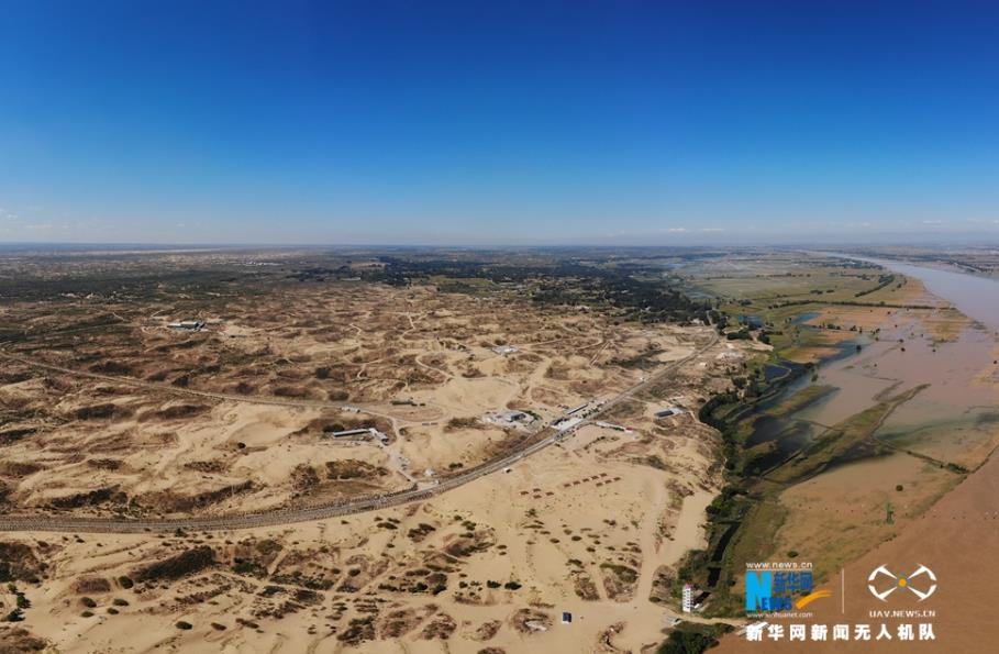 航拍黃河托克托段兩岸風光,西案的灘涂與沙漠相連。新華網(wǎng) 張偉 攝