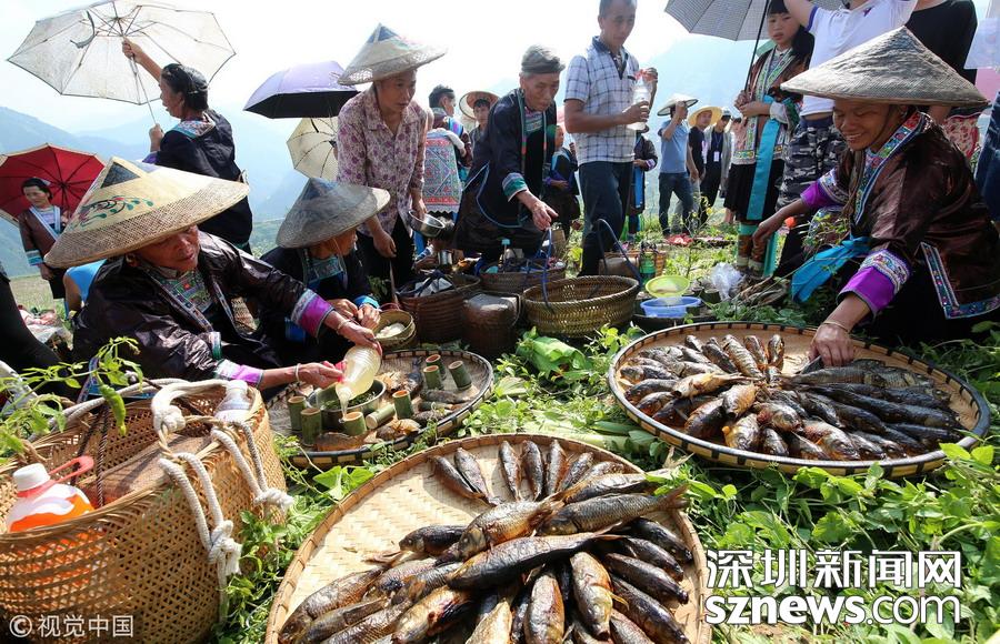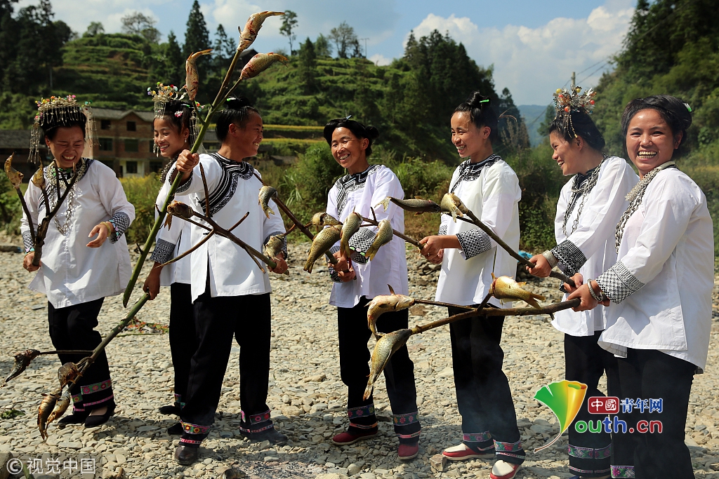 2016年9月17日,貴州省榕江縣平陽(yáng)鄉(xiāng)硐里村七位侗家婦女們正燒魚(yú)。每年中秋時(shí)節(jié),當(dāng)?shù)囟弊逋_(kāi)田放水,捉魚(yú),全寨男女老少,野外生起篝火烤魚(yú),用烤魚(yú)、米酒等,祭祀魚(yú)神,祈禱魚(yú)糧豐收的傳統(tǒng)民俗活動(dòng)。