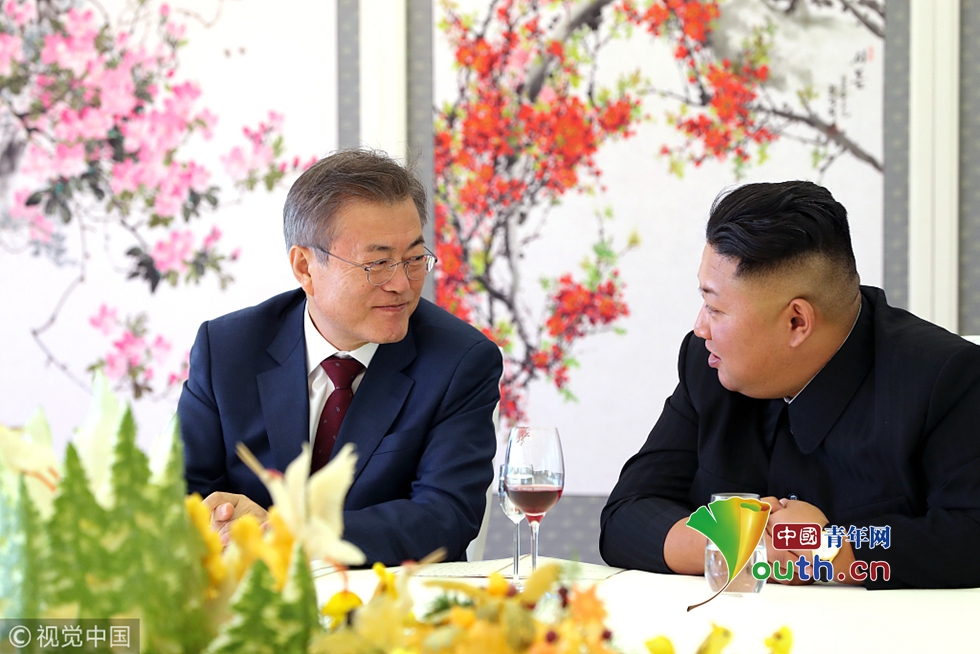 當(dāng)?shù)貢r間2018年9月20日,朝鮮,韓國總統(tǒng)文在寅在三池淵招待所和金正恩夫婦一起共進午餐。圖片作者:Yonhap News Agency/視覺中國