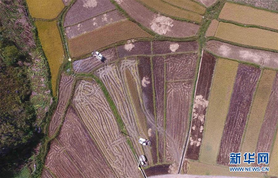 9月20日,廣南縣八寶鎮(zhèn)壩龍村的農(nóng)民在用收割機(jī)收稻谷(無人機(jī)拍攝)。 云南省文山壯族苗族自治州廣南縣八寶鎮(zhèn)今年種植優(yōu)質(zhì)水稻22000余畝,秋收季節(jié),田野里一片金黃,景色如畫。 新華社記者楊宗友攝