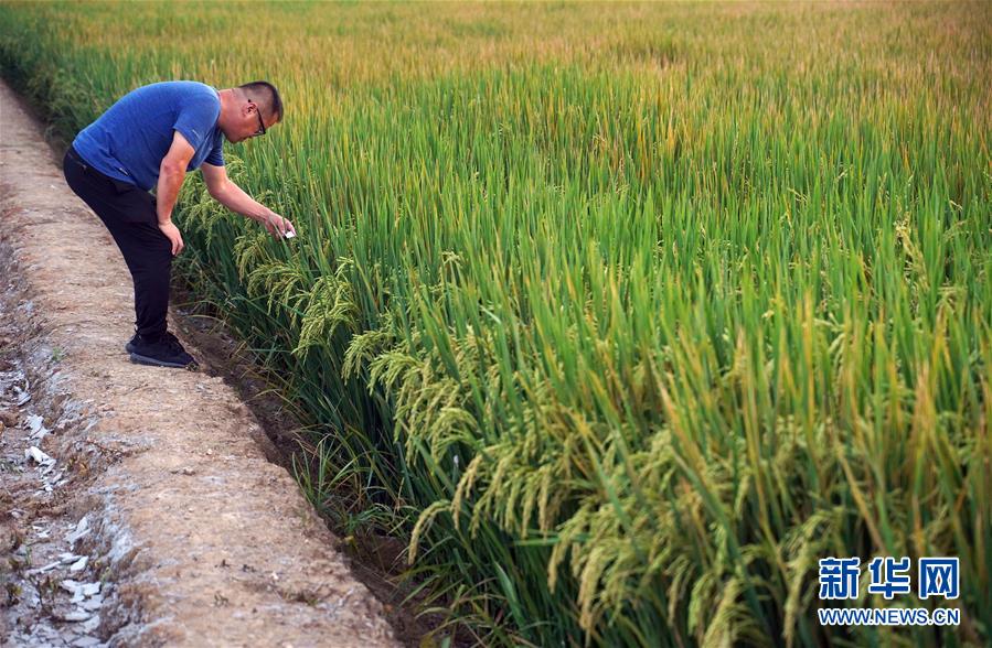 9月15日,北大荒集團(tuán)七星農(nóng)場駐小崗村技術(shù)負(fù)責(zé)人趙明武在小崗村的北大荒集團(tuán)現(xiàn)代化水稻生產(chǎn)基地檢查生物殺蟲卡。新華社記者才揚(yáng)攝