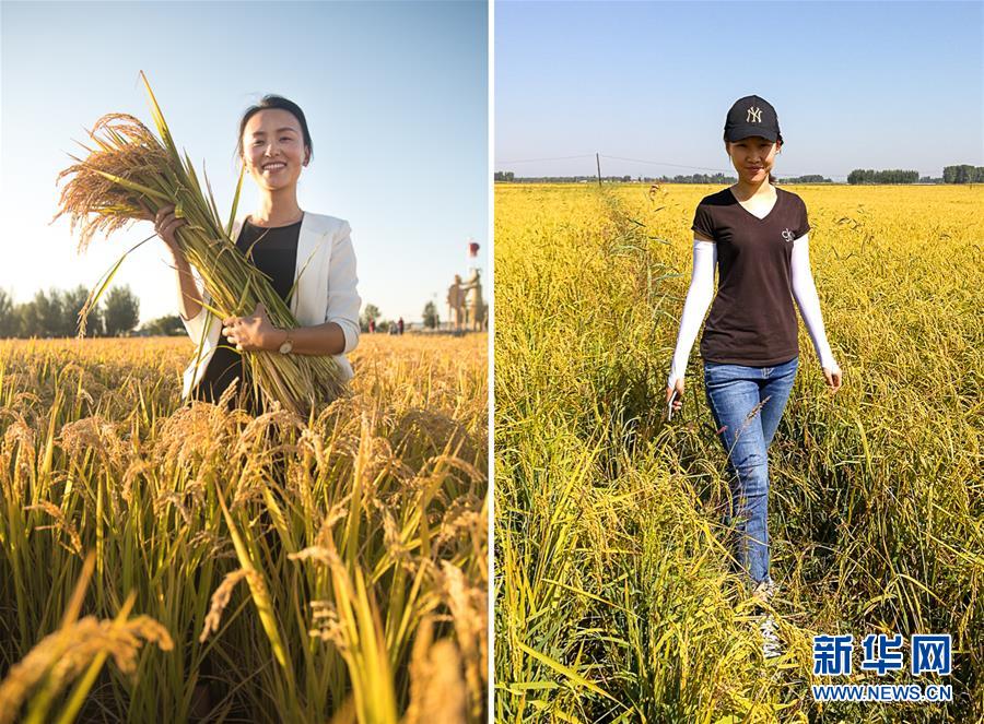 這是一張拼版照片。左圖:蔡雪手捧著剛收割的水稻(9月19日攝);右圖:張楠楠行走在稻田間(9月18日攝)。