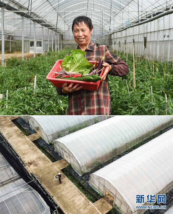 這張拼版照片顯示的是:上圖,9月20日,在江蘇省常州市鐘樓區(qū)鐘樓現(xiàn)代農(nóng)業(yè)產(chǎn)業(yè)園,菜農(nóng)邵新華展示剛采摘的蔬菜;下圖,9月20日,菜農(nóng)邵新華在農(nóng)業(yè)產(chǎn)業(yè)園的大棚旁搬運(yùn)蔬菜(無人機(jī)拍攝)。   新華社記者李博攝