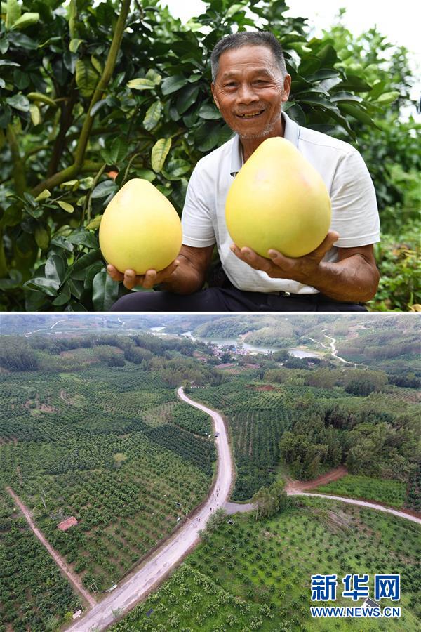 這張拼版照片顯示的是:上圖,9月18日,廣西武宣縣東鄉(xiāng)鎮(zhèn)風(fēng)沿村村民陳紹桂展示剛采摘的蜜柚;下圖,9月18日,人們?cè)陲L(fēng)沿村三紅蜜柚種植基地內(nèi)行走(無人機(jī)拍攝)。  新華社記者陸波岸攝