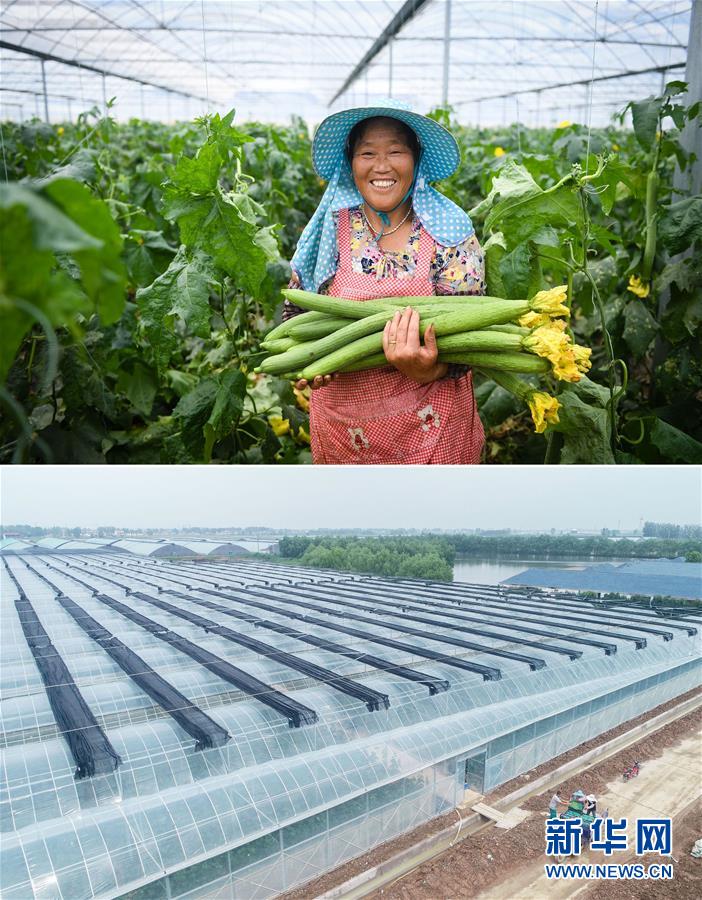 這張拼版照片顯示的是:上圖,9月21日,在江蘇省響水縣九豐現(xiàn)代高效農(nóng)業(yè)示范園的大棚內(nèi),56歲的農(nóng)民徐曉菊展示收獲的絲瓜;下圖,9月21日,徐曉菊(中)和村民一起搬運(yùn)收獲的絲瓜(無人機(jī)拍攝)。  新華社記者季春鵬攝
