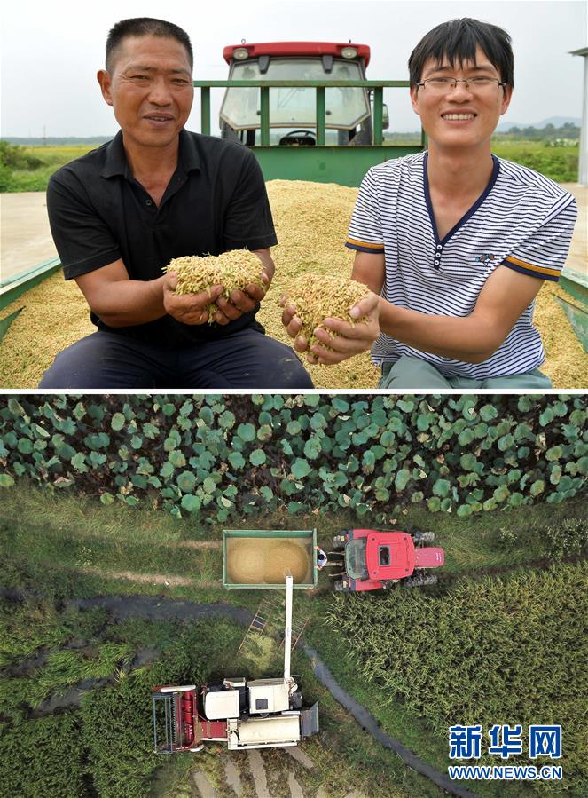 這張拼版照片顯示的是:上圖,9月21日,在江西省南昌市新建區(qū)留田村,種糧大戶周小林(左)、周標父子展示收獲的稻谷;下圖,9月21日,周小林、周標父子操作農機收割中稻,同時將稻谷裝入拖拉機(無人機拍攝)。 新華社記者彭昭之攝