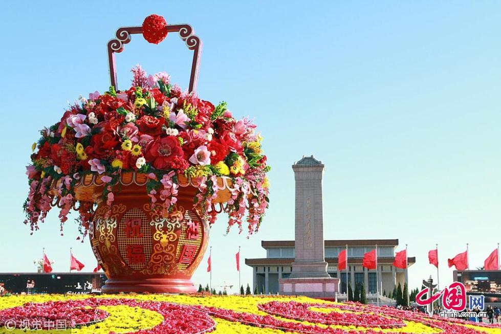 2012年天安門廣場中心花壇以“祝福祖國”為主題,以喜慶的花籃為主景?;▔睆?0米、頂高15米,以紅黃兩色為主打,花籃外圍,環(huán)繞著花草組成的祥云圖案。同時,主花壇設有燈光效果,即便是夜間游賞,也能清晰地看到“花容”。祝福祖國“花籃”凈高13米,籃盤直徑11米,真假花結合,選取牡丹、桃花、紫藤、百合等18個品種的花卉,最大花卉直徑2米?!盎ɑ@”通體中國紅,體現(xiàn)喜慶、祝福之意,配有金色紋絡,莊重、華貴?;@體鑲嵌三組“祝?!?、“祖國”字樣的燈箱?!盎ɑ@”底面是一品紅和小菊組成的如意圖案。