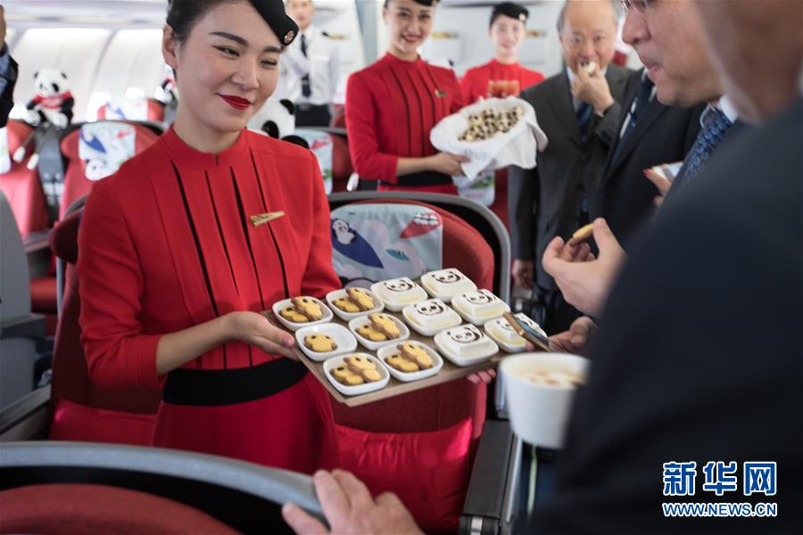 9月26日,在以色列特拉維夫本·古里安國(guó)際機(jī)場(chǎng),四川航空公司空乘人員在機(jī)上展示熊貓主題的小吃。  新華社記者郭昱攝