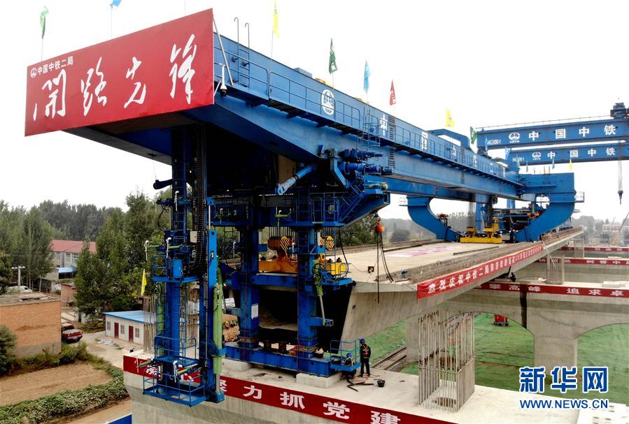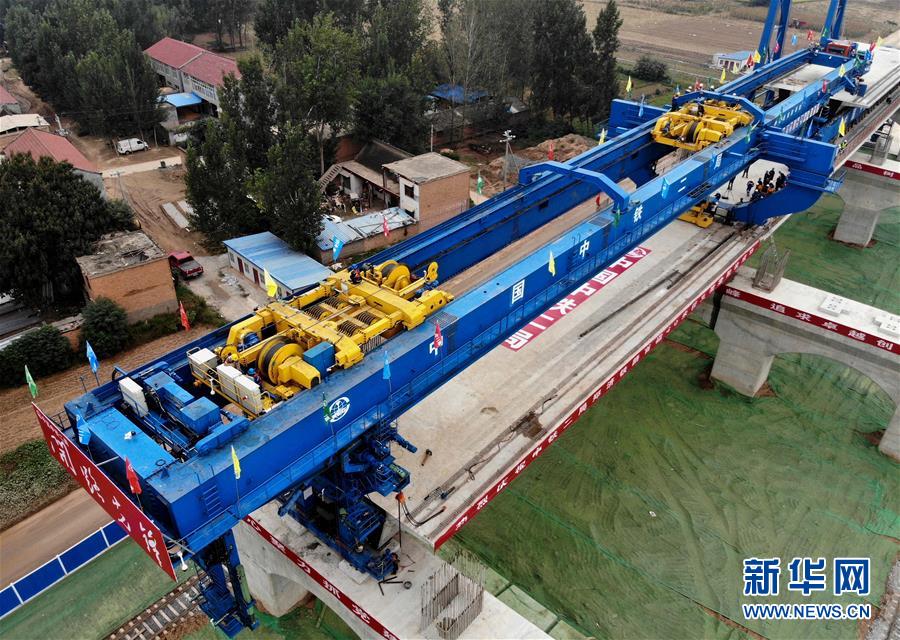 9月27日,中鐵二局的施工人員使用大型機械在鄭(州)濟(南)高速鐵路(鄭濮段)站前工程VI標施工現場架設40米簡支箱梁(無人機拍攝)。 新華社記者李安攝