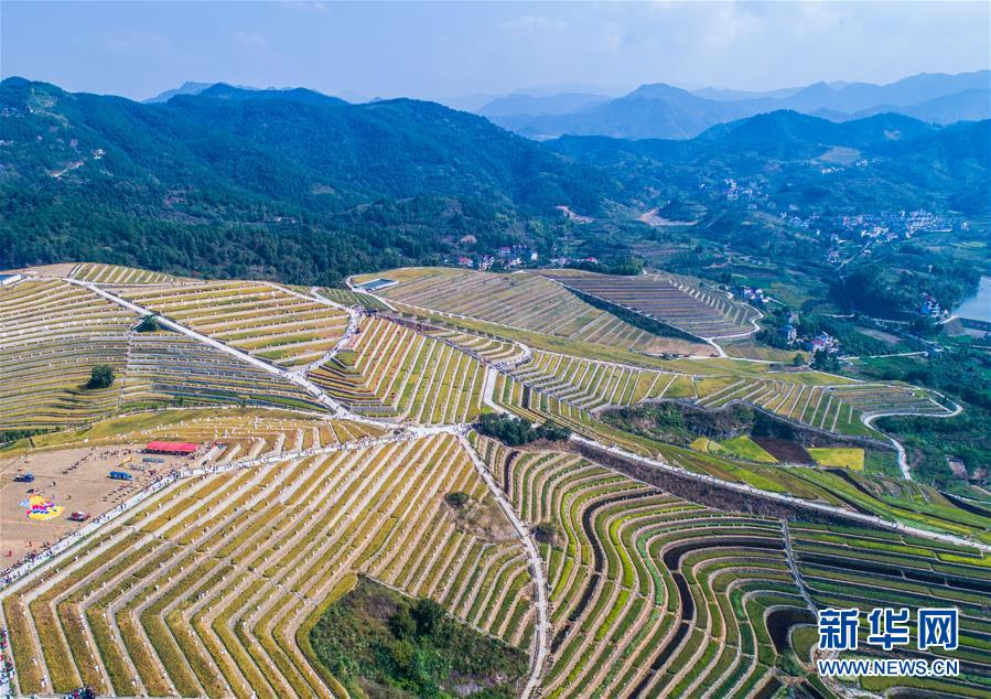 9月29日,太極拳愛(ài)好者在建德市大洋鎮(zhèn)高垣村的千畝梯田上進(jìn)行表演(無(wú)人機(jī)拍攝)。當(dāng)日,2000多名太極拳愛(ài)好者在浙江省建德市大洋鎮(zhèn)高垣村的千畝梯田上參加太極拳表演,吸引很多當(dāng)?shù)厝撕陀慰颓皝?lái)觀賞,助力當(dāng)?shù)亟鹎飼r(shí)節(jié)鄉(xiāng)村旅游。近兩年來(lái),大洋鎮(zhèn)充分利用土地整治后形成的千畝梯田打造農(nóng)業(yè)觀光綜合體,發(fā)展綜合型農(nóng)業(yè)觀光旅游,為鄉(xiāng)村振興注入新活力。新華社記者徐昱攝