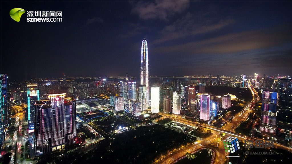 深圳中心區(qū)夜晚上演的燈光秀表演。