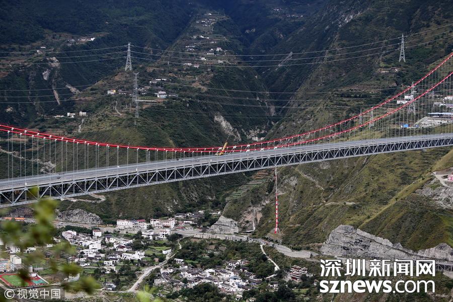 大橋擁有2個(gè)“第一”:主跨1100米,成為川藏在建第一大跨徑鋼桁梁懸索橋;雅安岸隧道式錨碇長159米,更是成為世界上在建第一長。