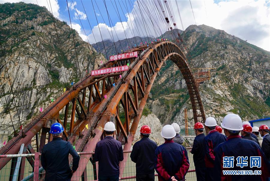 9月28日拍攝的川藏鐵路拉林段重點標志性工程藏木特大橋合龍儀式現(xiàn)場。 當日,隨著最后一節(jié)鋼管拱的對位和鎖定完畢,川藏鐵路拉林段藏木特大橋成功合龍,標志著大橋主體結構施工取得了關鍵性勝利。藏木特大橋由中國中鐵廣州局集團承建,拱高112米,橋橫跨雅魯藏布江峽谷,水深66米。 新華社記者普布扎西攝