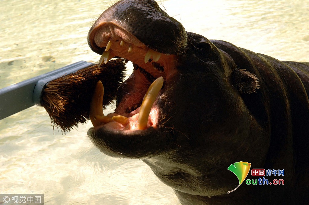 2006年7月20日,英國倫敦動物園里,工作人員正在用一個新的5英尺長的牙刷給河馬Thug刷牙。動物園里的兩只河馬Nicky與Thug,它們分別有一個粉色和藍(lán)色的牙刷。為了慶祝換新牙刷,倫敦動物園將在23日“不要忘記牙刷日”實行入園半價優(yōu)惠。