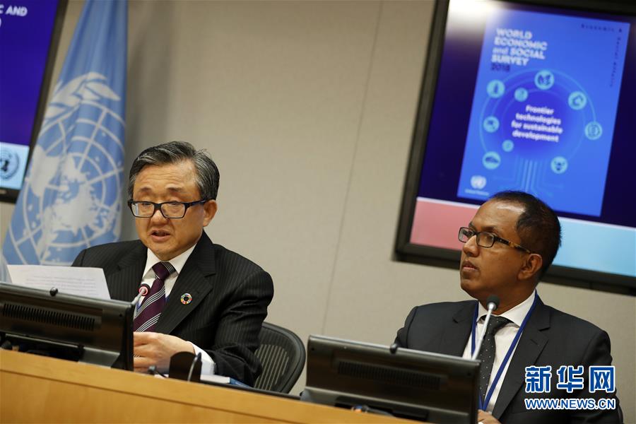 10月8日,在位于紐約的聯(lián)合國總部,聯(lián)合國負(fù)責(zé)經(jīng)濟(jì)和社會事務(wù)的副秘書長劉振民(左)向記者介紹《2018年世界經(jīng)濟(jì)和社會概覽》。新華社記者李木子攝