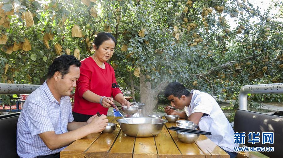甘永軍(左一)在地處新疆阿克蘇地區(qū)柯柯牙綠化工程內(nèi)的果園吃飯(2017年9月22日攝)。10年前,甘永軍還在果園開(kāi)起了第一個(gè)農(nóng)家樂(lè),帶動(dòng)周邊100多戶果農(nóng)經(jīng)營(yíng)起了自家庭院。 在世界第二大流動(dòng)性沙漠——塔克拉瑪干沙漠西北邊,一條逾百萬(wàn)畝的人工林帶傲然挺立。 這條林帶就是柯柯牙荒漠綠化工程。它是新疆阿克蘇黃沙漫漫和碧波萬(wàn)頃的分界嶺。 1986年,為改變惡劣的自然條件,阿克蘇啟動(dòng)柯柯牙綠化工程。30年間,各族干部群眾攜手奮斗,曾是沙塵暴策源地的柯柯牙綠樹(shù)成蔭;并以此為原點(diǎn),在南疆戈壁荒灘上孕育出百萬(wàn)畝的“綠?!薄?30多年來(lái),阿克蘇打造出“人走政不息”的樣本,使綠色發(fā)展理念成為幾代人的廣泛共識(shí);“自力更生、艱苦奮斗、無(wú)私奉獻(xiàn)”的柯柯牙精神,已融入各族兒女血液中;“以林養(yǎng)林”“邊綠化邊脫貧”的綠化、脫貧方式,給其他荒漠地區(qū)貢獻(xiàn)了“柯柯牙智慧”。 新華社記者 杜剛 攝