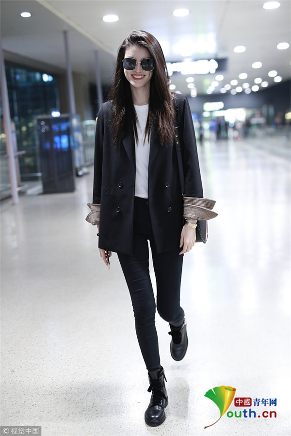 2018年10月15日,上海,何穗亮相機(jī)場(chǎng)。她身穿深色西裝搭配黑色緊身褲大秀超模身材,簡(jiǎn)約造型依舊高級(jí)感十足,輕撩秀發(fā)散發(fā)女人味。