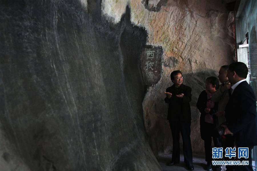 10月16日,成縣文物保護專家張建文(左一)向客人講解漢代摩崖石刻《西狹頌》。 新華社記者 陳斌 攝