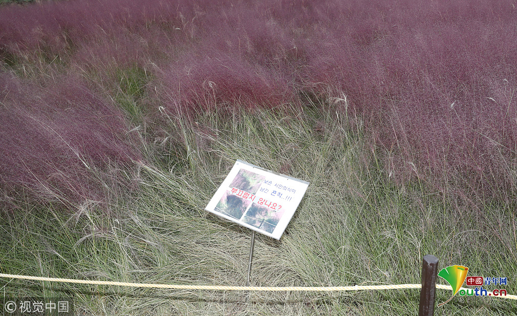 韓國蔚山,近日,蔚山公園大片粉黛亂子草盛開,但部分花海遭游客隨意踩踏。公園并沒有修復遭破壞區(qū)域,而是用繩索圍起并掛上批判性告示,呼吁游客腳下留情。圖片作者:Yonhap News Agency