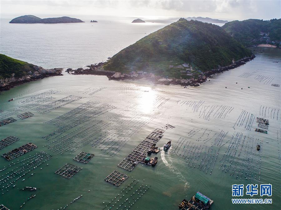 8月18日,南麂島馬祖岙海域的“海上牧場”養(yǎng)殖區(qū)(無人機拍攝)。南麂島位于浙江東南海域,水質好,水溫、鹽度都適合大黃魚等養(yǎng)殖魚類的生長繁殖,因此當?shù)氐乃a品也一直保持了較高的品質和口碑。進入8月,浙江省溫州市平陽縣南麂鎮(zhèn)海域上大片的大黃魚、貽貝等特色海產品養(yǎng)殖區(qū)域迎來豐收季節(jié),養(yǎng)殖戶們駕駛漁船在養(yǎng)殖區(qū)海域進行打撈收獲,在碧海藍天下構成了一幅“海上牧場”的美麗豐收景象。近年來,南麂鎮(zhèn)政府引導漁民養(yǎng)殖戶充分發(fā)揮“靠海吃?!钡馁Y源優(yōu)勢,大力發(fā)展海洋養(yǎng)殖經濟和海島旅游經濟,實現(xiàn)了南麂由“生態(tài)美”向“產業(yè)美”,“產業(yè)美”向“經濟美”的轉變。同時該鎮(zhèn)堅持以大黃魚、貽貝等為特色產業(yè)支撐,精準發(fā)展高效海洋養(yǎng)殖業(yè),重點培養(yǎng)一批新型職業(yè)漁民,依靠專業(yè)技術支持,實現(xiàn)深海仿生養(yǎng)殖,讓好生態(tài)造就好品質,重點打造南麂養(yǎng)殖品牌,組建營銷網(wǎng)絡,拓展特色海產品市場。新華社記者 徐昱攝