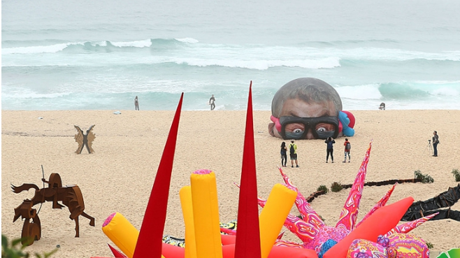慎點!澳大利亞邦迪海灘雕塑展一幕