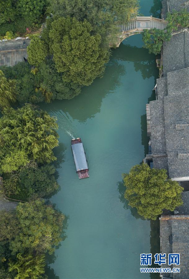10月18日,一艘游船行駛在烏鎮(zhèn)水道上(無人機(jī)拍攝)。新華社記者翁忻旸攝