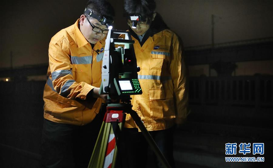 10月18日,劉訓(xùn)飛(左)在滬寧城際上海安亭北線路所42#道岔上進(jìn)行線路檢測作業(yè)時,向徒弟郎海鵬講解全站儀設(shè)置方法。新華社記者 方喆 攝