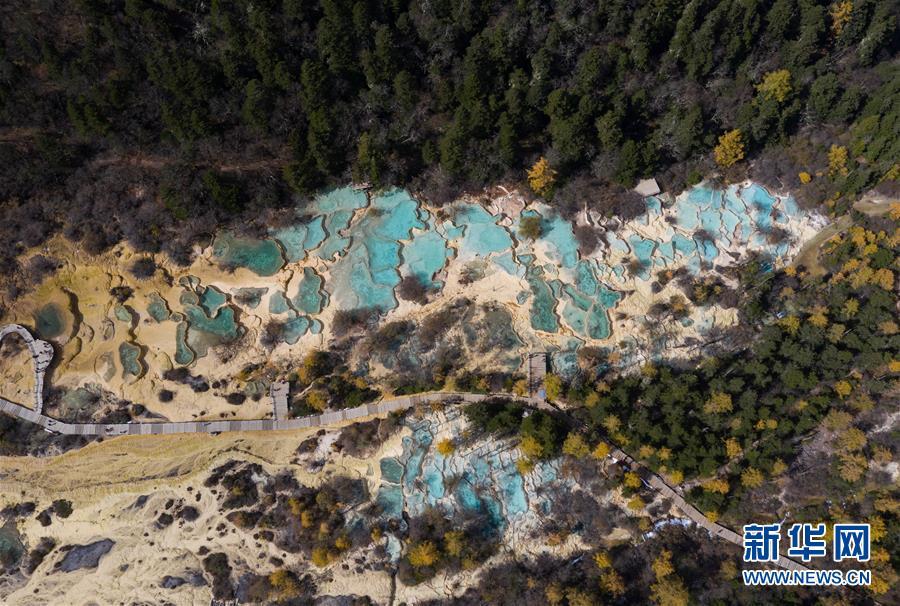 俯瞰黃龍溝爭(zhēng)艷池一角(10月19日無人機(jī)拍攝)。深秋時(shí)節(jié),在雪山、藍(lán)天、白云和彩林映襯下,黃龍溝中的彩池色彩更加斑斕,目前黃龍景區(qū)進(jìn)入觀賞最佳時(shí)節(jié)。黃龍風(fēng)景名勝區(qū)位于四川省松潘縣境內(nèi),以彩池、灘流、雪山、峽谷、森林等聞名,享有“人間瑤池”“圣地仙境”之美譽(yù)。新華社記者 江宏景攝