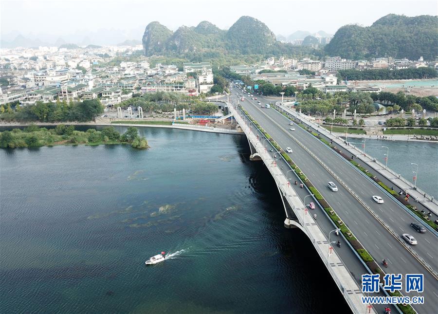 船只從橫跨漓江的廣西桂林市解放橋旁駛過(10月17日無人機拍攝)。 江作青羅帶,山如碧玉簪。1100多年前,唐朝詩人韓愈寫盡桂林山水之美。千百年來,桂林的青山綠水成為歷朝歷代文人騷客筆下的“人間仙境”。 保護好桂林山水,既是對祖國大好河山負責(zé),更是對歷史負責(zé)。近年來,尤其是黨的十八大以來,桂林嚴守生態(tài)底線,以前所未有的力度截污治河,保護漓江最美山水,推動城鄉(xiāng)統(tǒng)籌協(xié)調(diào)發(fā)展,不斷擴大對外開放合作力度,努力在青山綠水里走出一條生態(tài)文明路。 新華社記者 周華 攝