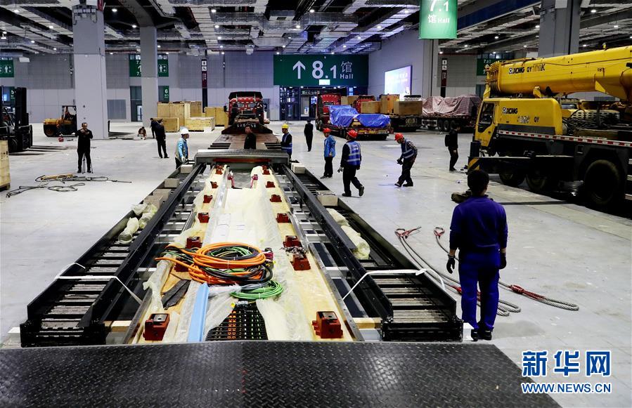 10月22日,“金牛座”龍門銑床床身(前)等待裝運(yùn)。 當(dāng)日,來自德國的首屆進(jìn)口博覽會(huì)最大展品——“金牛座”龍門銑床完成初步組裝,將運(yùn)往國家會(huì)展中心(上海)3號(hào)館進(jìn)行最后的安裝施工。這是德國瓦德里希科堡公司研發(fā)的機(jī)床設(shè)備,高約8米,占地面積約200平方米,將在智能及高端裝備區(qū)進(jìn)行展出。 新華社記者方喆攝