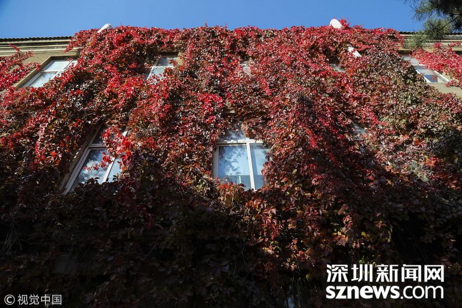 最美校園 !大學內(nèi)建筑被爬山虎包圍 滿墻火紅美如畫