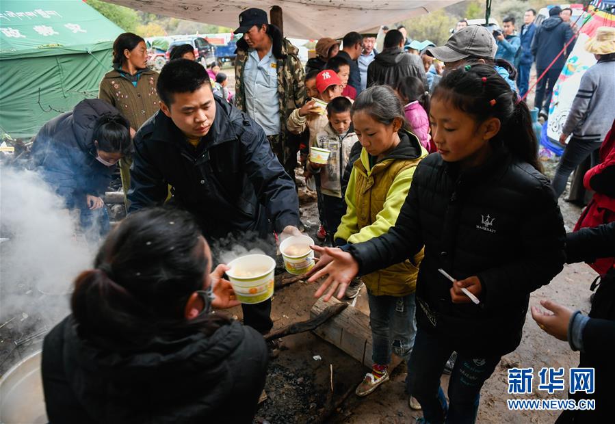 波羅鄉(xiāng)工作人員在熱多村安置點(diǎn)內(nèi)的“臨時做飯點(diǎn)”為波羅鄉(xiāng)第一小學(xué)學(xué)生盛晚飯(10月14日攝)。