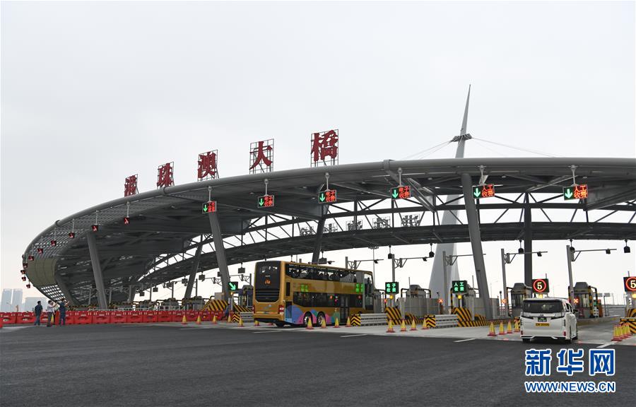 10月24日,跨境巴士在澳門口岸離境車道上通關(guān)。當日9時,港珠澳大橋正式通車。 新華社記者張金加攝