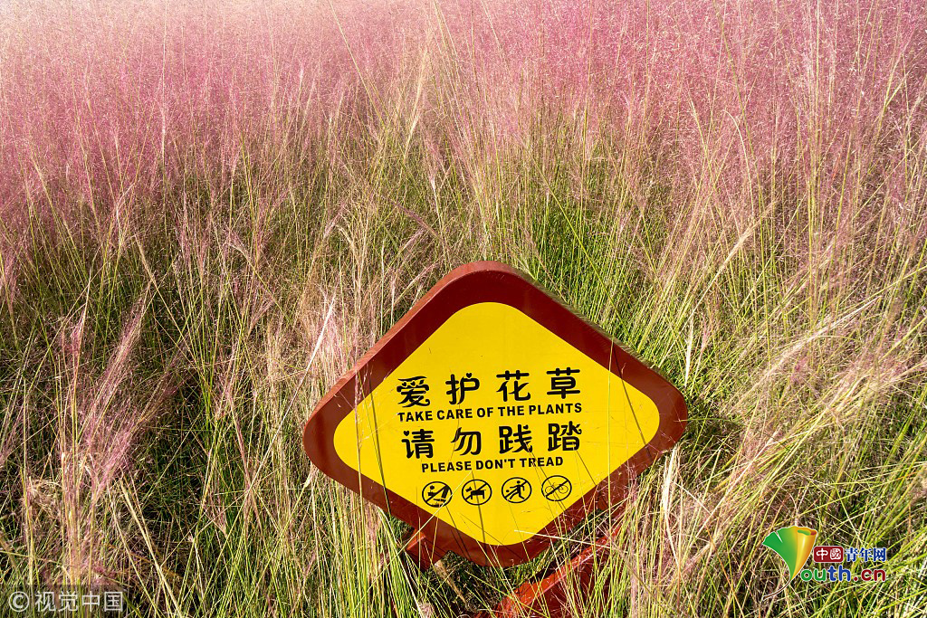 當(dāng)?shù)貢r(shí)間2018年10月16日,韓國蔚山,近日,蔚山公園大片粉黛亂子草盛開,粉紅花海浪漫十足,但部分花海遭游客隨意踩踏。公園并沒有修復(fù)遭破壞區(qū)域,而是用繩索圍起并掛上批判性告示,呼吁游客腳下留情。圖片作者:Yonhap News Agency