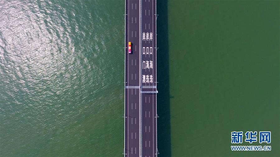 10月24日,一輛巴士行駛在港珠澳大橋上(無人機拍攝)。 當日,港珠澳大橋正式通車。