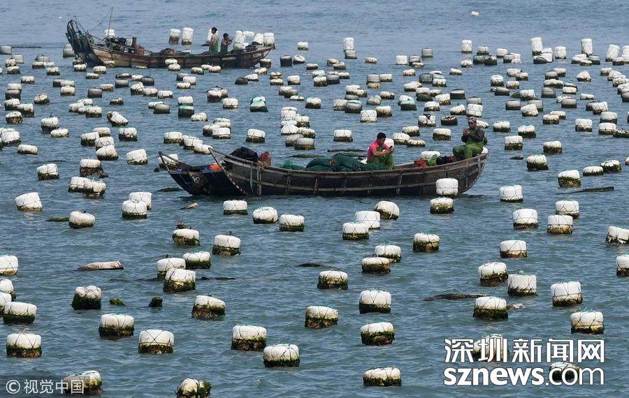 2018年10月26日,在福建連江海域上,“海上田園”網(wǎng)箱羅列,漁排上搭建的木屋錯(cuò)落成“戶”,蔚為壯觀,成為一道獨(dú)特的風(fēng)景線。福建省連江縣是中國(guó)鮑魚(yú)養(yǎng)殖第一大縣。