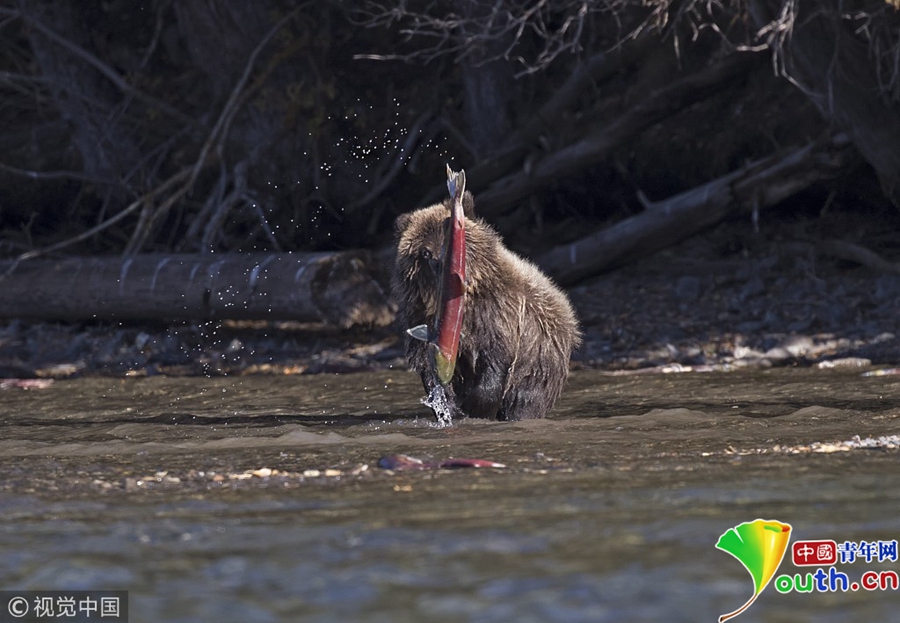 2018年10月29日訊(具體拍攝時(shí)間不詳),加拿大英屬哥倫比亞,一只15個(gè)月大的棕熊幼崽在Chilko Lake湖畔成功捉到一只4公斤重的紅色鮭魚。