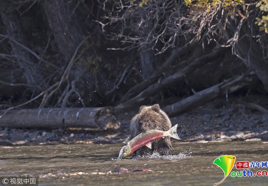 小棕熊成功捉到紅色鮭魚。