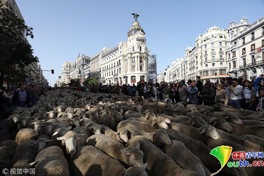 西班牙牧羊人驅(qū)趕羊群穿越馬德里 羊群進(jìn)城“參觀”